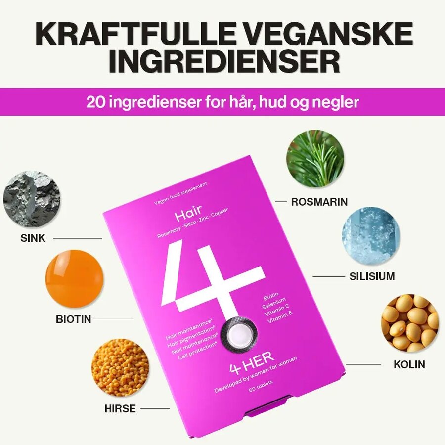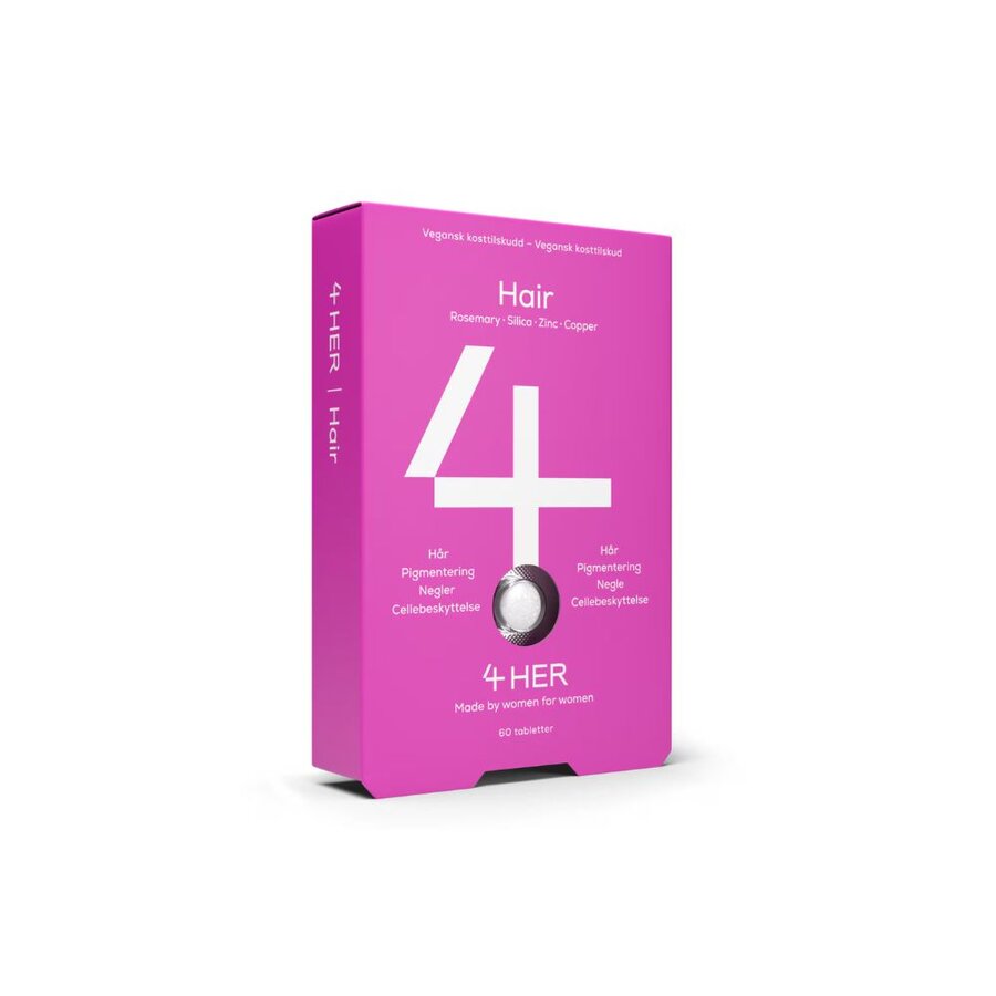 4HER Hair er et kosttilskudd utviklet for kvinner som ønsker støtte til hårets normale funksjon og pigmentering. Formelen kombinerer vitaminer, mineraler og planteekstrakter, og er utviklet med fokus på kvalitet, renhet og daglig bruk.