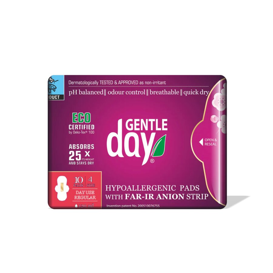 Gentle Day er et hypoallergenisk og pH-balansert bind som er utviklet med tanke på din helse og miljøet vårt. Her blir man tilbudt maksimal komfort samtidig som man får en effektiv beskyttelse mot lekkasjer. Bindet har en innovativ FAR-IR ANION Strip™ som bidrar til naturlig luktkontroll og optimal hygiene. I tillegg er produktet pustende, fleksibelt og utstyrt med et supertynt lag med polymer - som kan absorbere flere hundre ganger sin egen vekt.