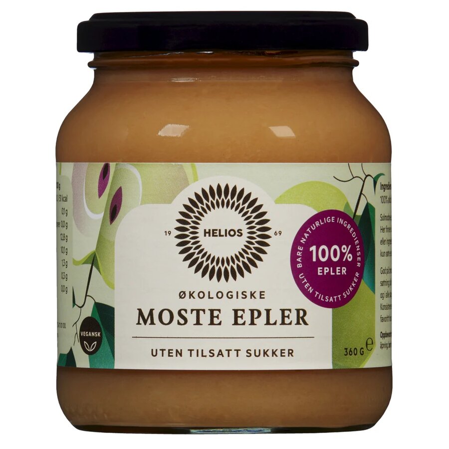 Helios Eplemos Usøtet er laget av 100% solmode og søte epler. Disse er kokt til mos og deretter fylt på glass. Eplemosen smaker godt både på brødskiven, til dessert og i kaker - så dette kan fort bli en favoritt hos barna!