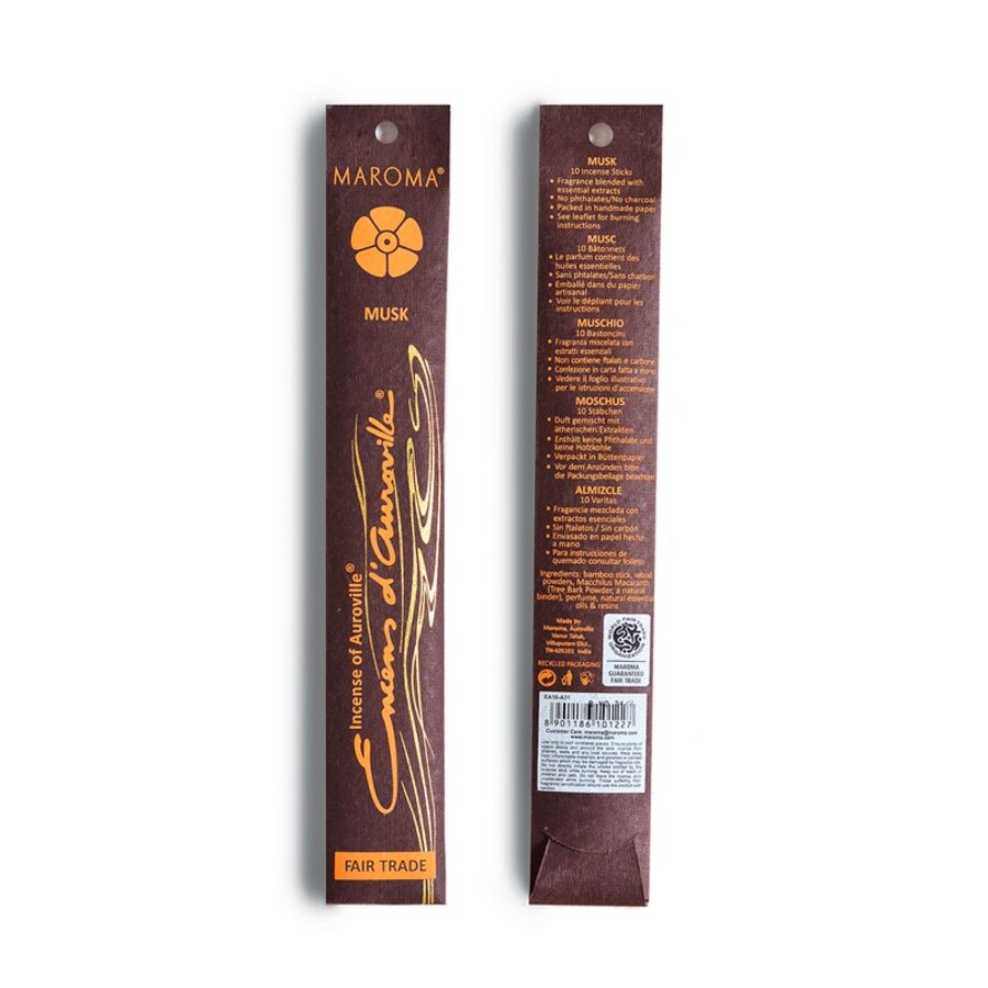 Maroma pakker røkelsespinnene inn i et vakkert silketrykt, håndlaget papir som er laget av resirkulert bomullsgarn. Hver pakke inneholder ti pinner og hvet pinne varer i cirka 45 minutter.