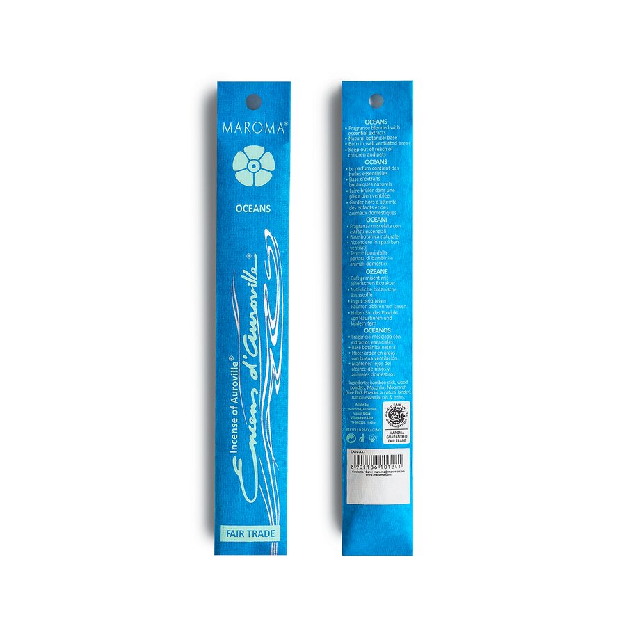 Maroma pakker røkelsespinnene inn i et vakkert silketrykt, håndlaget papir som er laget av resirkulert bomullsgarn. Hver pakke inneholder ti pinner og hvet pinne varer i cirka 45 minutter.
