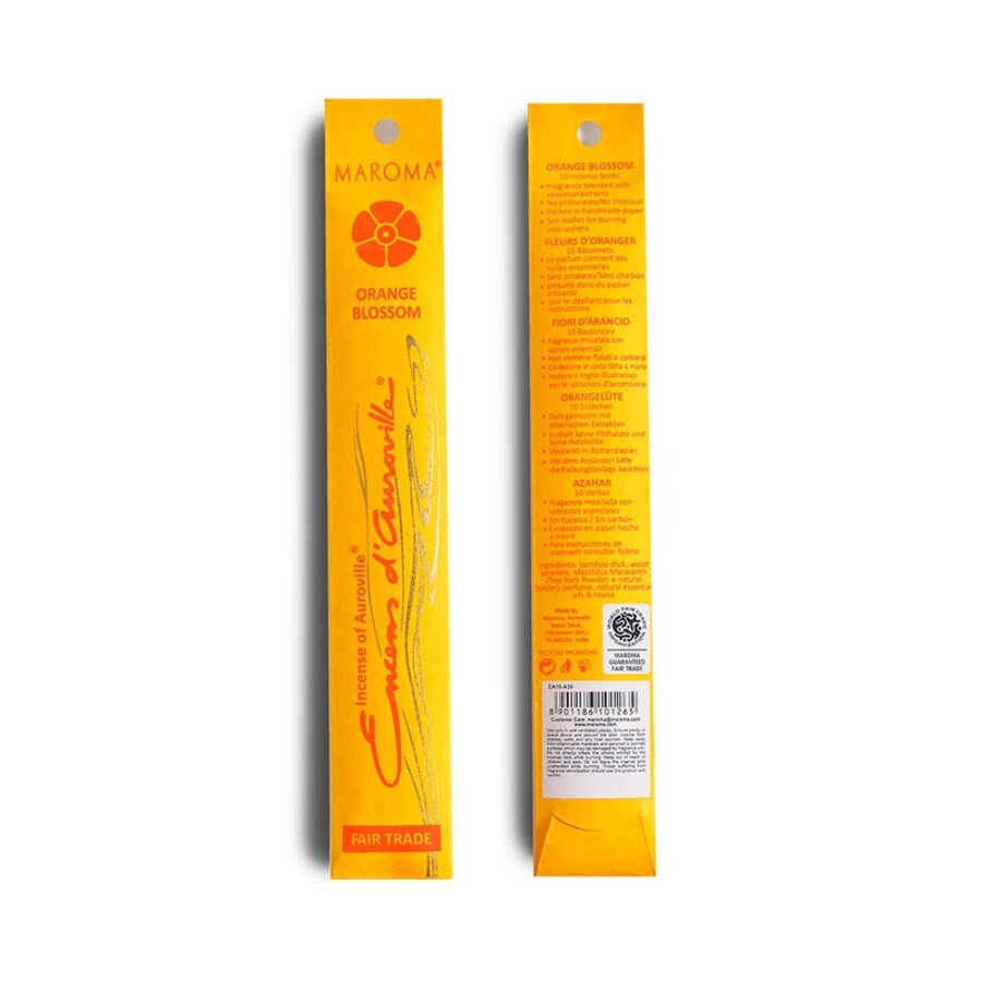 Maroma pakker røkelsespinnene inn i et vakkert silketrykt, håndlaget papir som er laget av resirkulert bomullsgarn. Hver pakke inneholder ti pinner og hvet pinne varer i cirka 45 minutter.