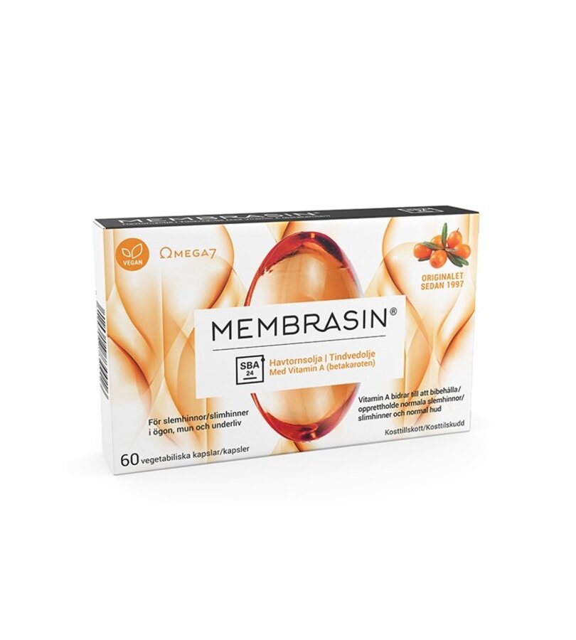 Membrasin 120 kapsler er et kosttilskudd med ekstrakt fra tindved. Inneholder flere forskjellige fettsyrer, og framfor alt Omega-7. Membrasin inneholder i tillegg karotenoider og E-vitamin som finnes naturlig i tindved. Karotenoidene kan i kroppen omdannes til vitamin A, som bidrar til å opprettholde normale slimhinner og hud.