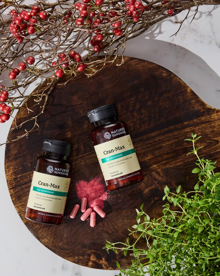 Nature's Sunshine Cran-Max inneholder tranebærpulver og buchuekstrakt og kan benyttes mot lett blærekatarr.
