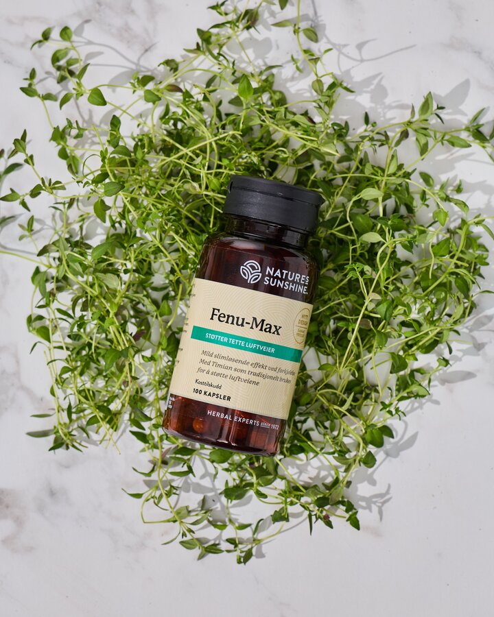 Nature's Sunshine Fenu-Max virker lett slimløsende og inneholder bukkehornfrø og timian.