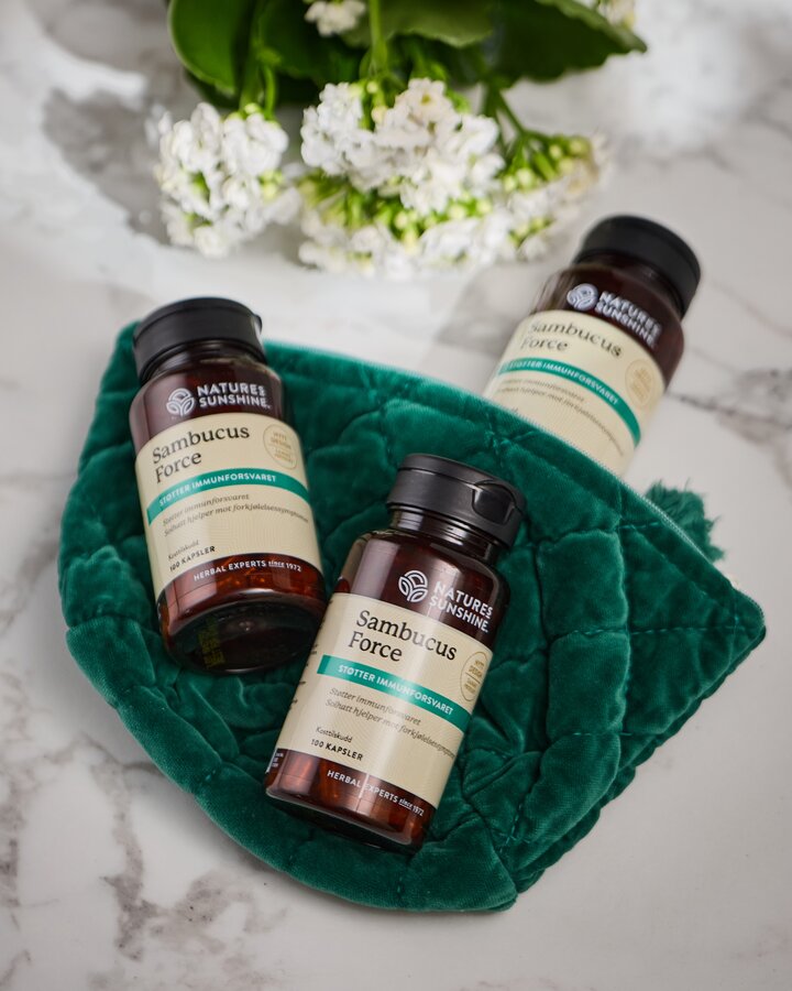 Nature's Sunshine Sambucus Force inneholder svarthyllebær og solhatt og kan bidra til å styrke immunforsvaret.