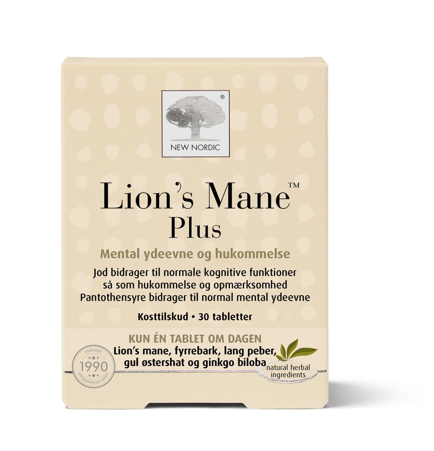 New Nordic Lion's Mane er et kosttilskudd som kan bidra til normal mental yteevne og kognitive funksjoner. Produktet inneholder ekstrakter av soppen Lion's Mane, samt furubark og lang pepper. I tillegg inneholder det flere typer B-vitaminer, vitamin D og jod. Jod bidrar til normale kognitive funksjoner som hukommelse og oppmerksomhet.