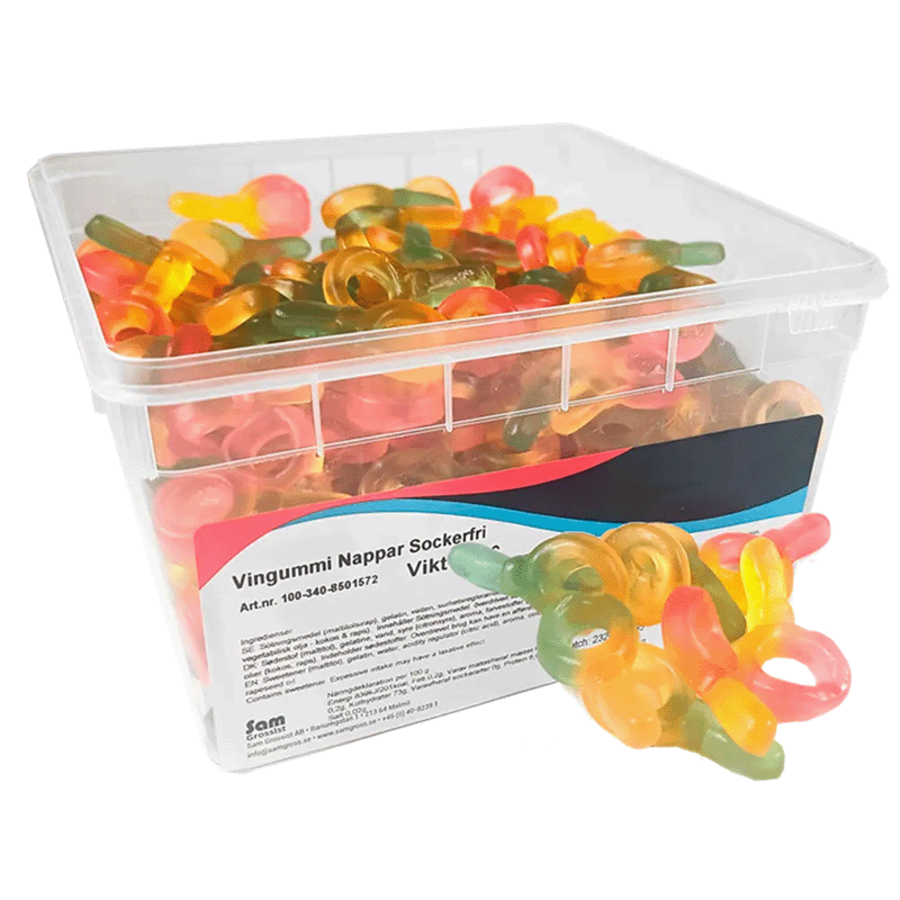 Sam Smokker Sukkerfri er den ultimate sukkerfrie vingummien for alle som elsker den klassiske smaken og formen på smokker. Med en deilig, fruktig smak gir disse sukkerfrie godbitene en tilfredsstillende søtsmak uten unødvendige kalorier. Perfekte til å fylle godteskålen hjemme eller å dele med venner og familie. Pakken på 2 kg gir deg rikelig med smokker som varer, og de er ideelle for både fest og hverdagskos. Nyt dem med god samvittighet – uten sukker, men med masse smak!