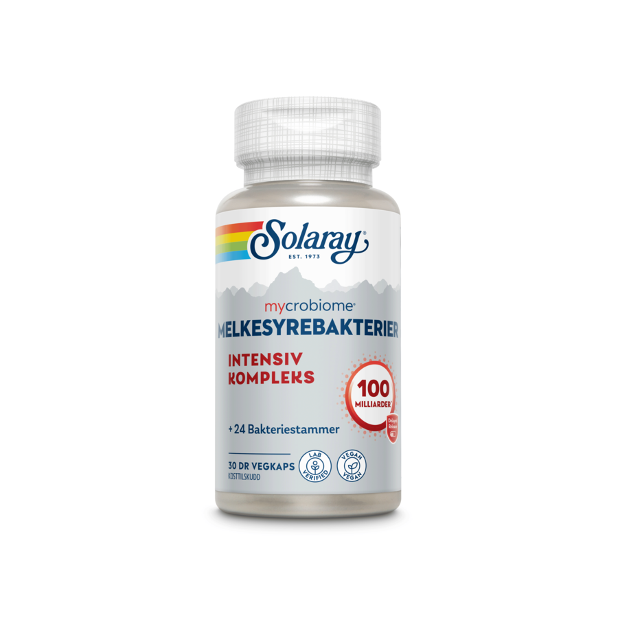 - Solaray Mycrobiome Intensiv inneholder 100 milliarder melkesyrebakterier.